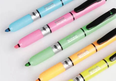WYSUWANE ZNACZNIKI FLUORESCENCYJNE Wśród materiałów, których nigdy nie powinno zabraknąć w szkolnym lub biurowym piórniku są zakreślacze fluorescencyjne. Są one niezbędne do nauki lub podkreślania ważnych dokumentów. Wśród naszej szerokiej gamy zakreślaczy znajduje się Click Highlighter od MP. Jest to nowy, bardziej kompaktowy zakreślacz z mechanizmem chowania. W przeciwieństwie do konwencjonalnych zakreślaczy, Click Highlighter chowa… -